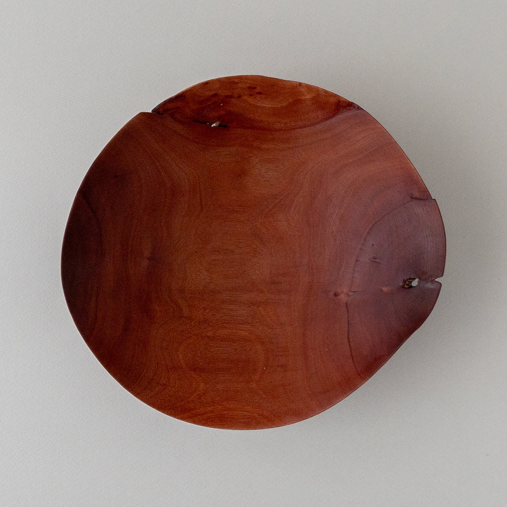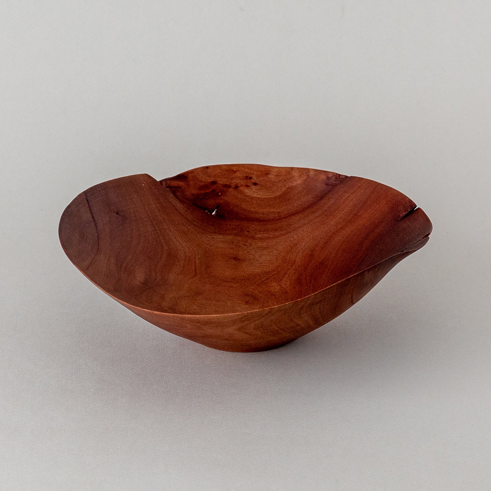 薄く引き乾燥と共に縁に歪みを出したアカギの器。使うにつれ深い色味へと経年変化する。