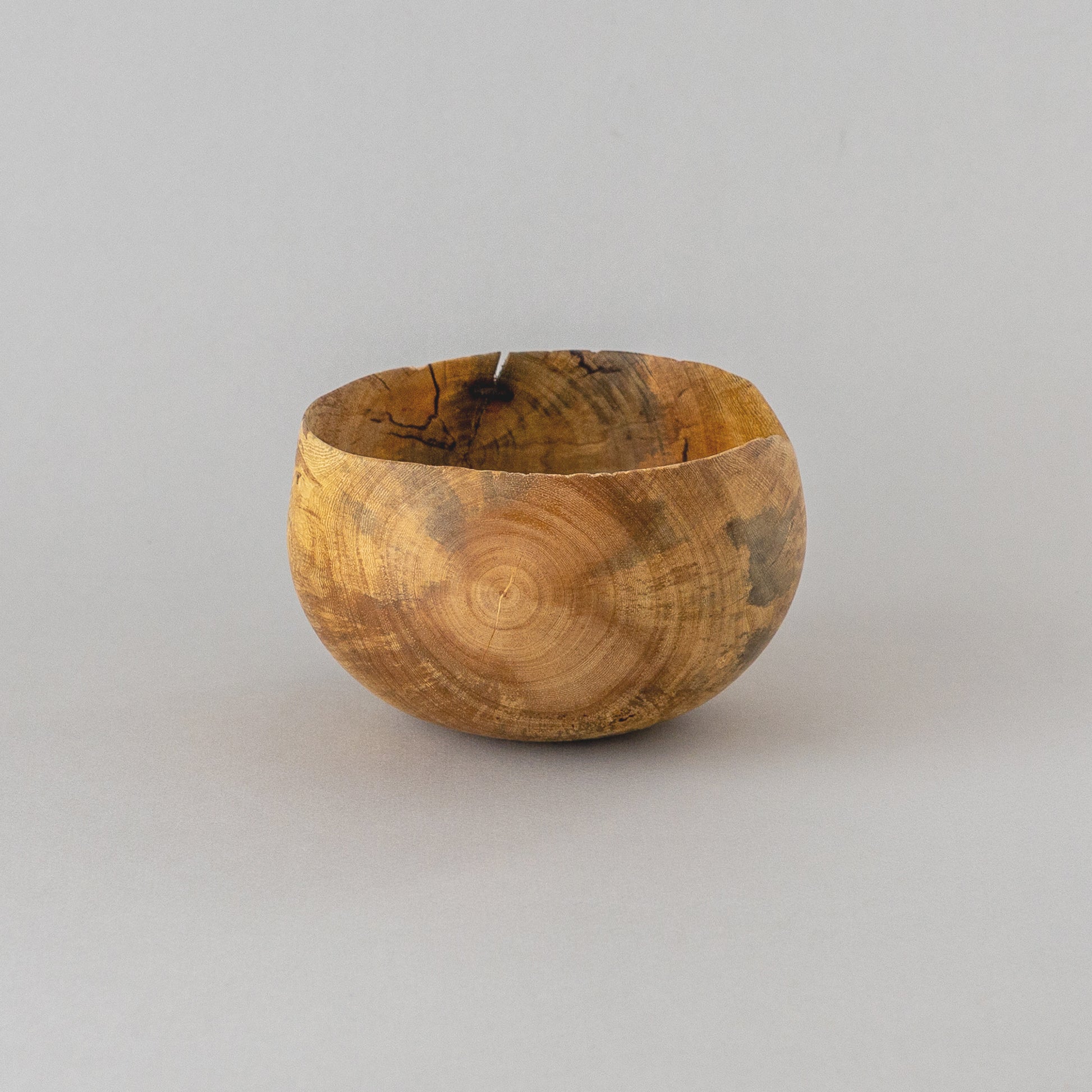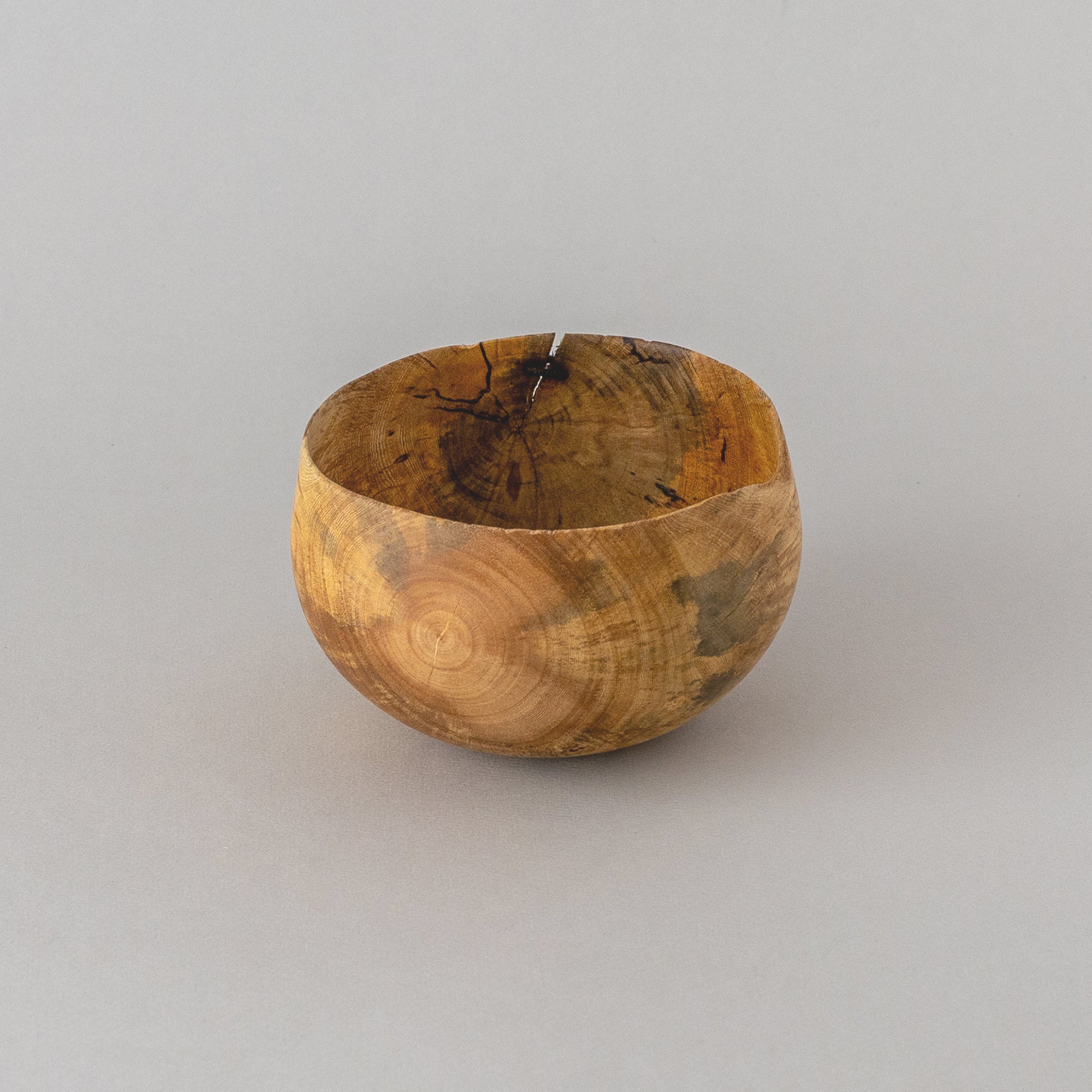 主に沖縄の木を使って器を製作している藤本健。ひとつひとつ手作りのため、同じ形でも若干の個体差があります。きれいな成形の器だけではなく、少ゆがんだり、欠けたり、割れたりした要素もデザインの一部としてとらえ、個性的な器作りを目指している。水分を含んだ生木で成形するため、時間の経過とともに柔らかい部分が堅い部分に引っ張られて、変形していく。変形の度合いを予測し、最終的には木に委ねてできる唯一無二の器。