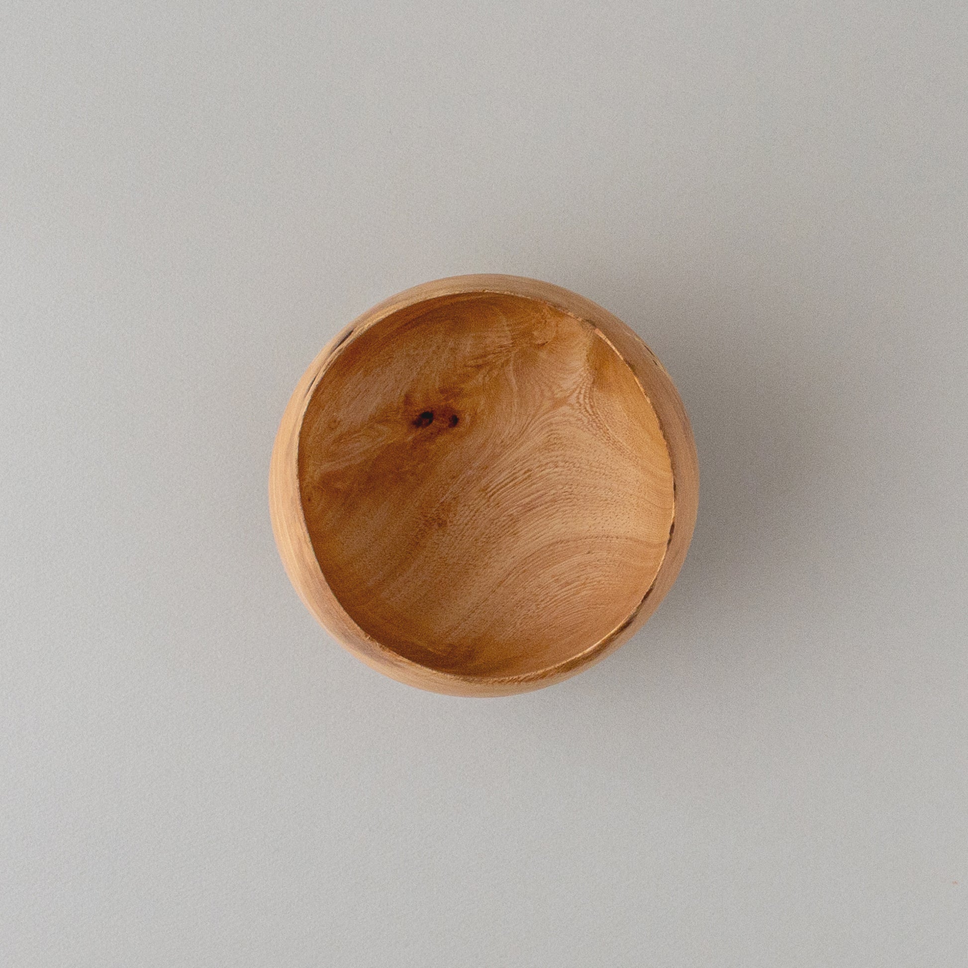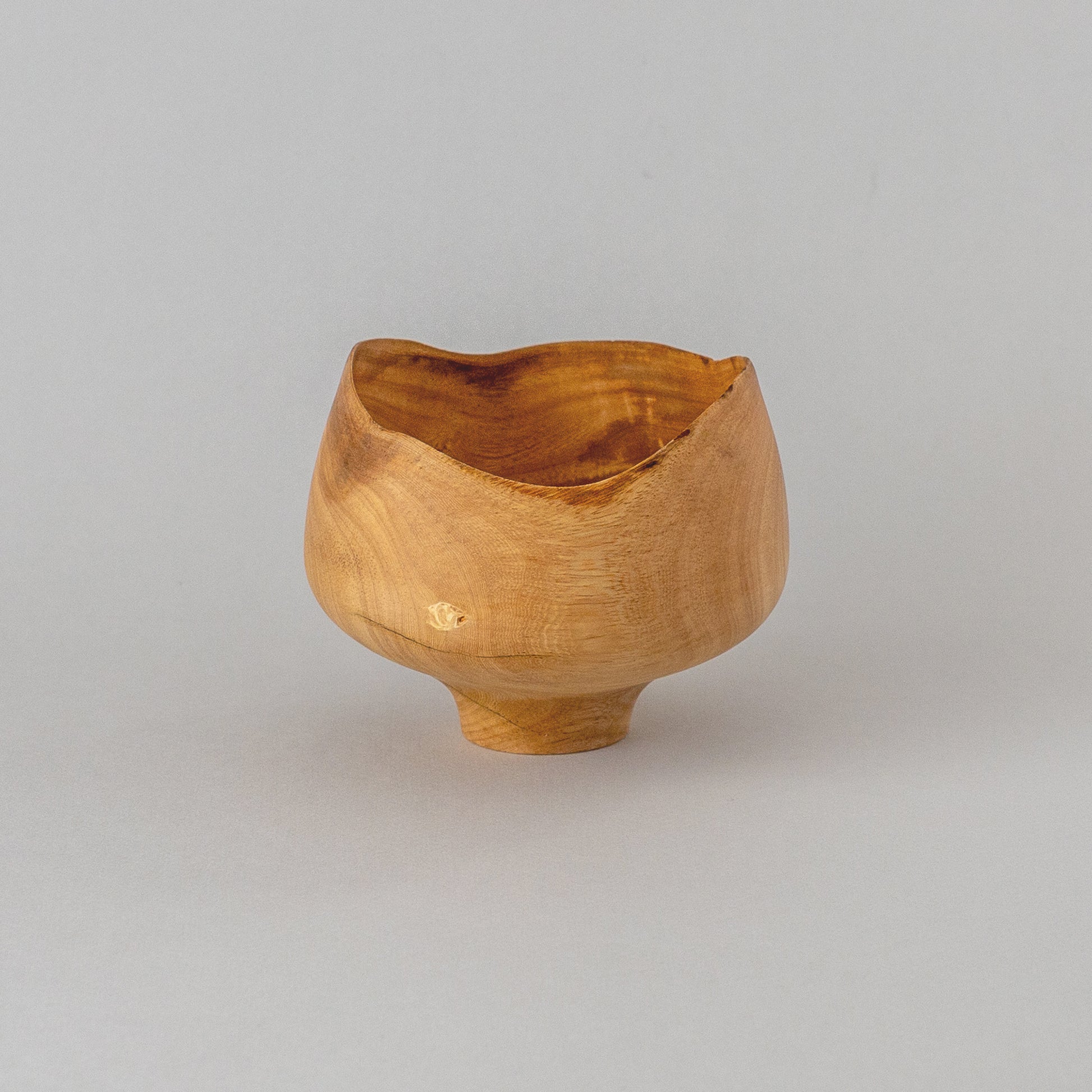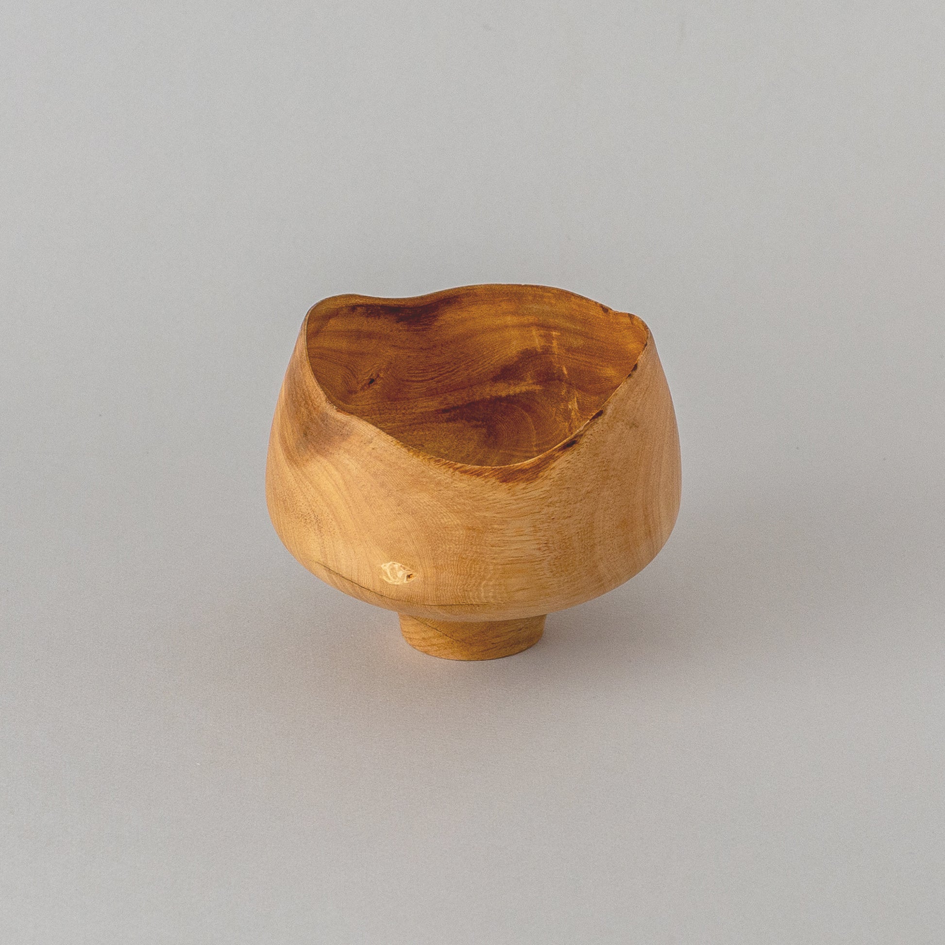 主に沖縄の木を使って器を製作している藤本健。ひとつひとつ手作りのため、同じ形でも若干の個体差があります。きれいな成形の器だけではなく、少ゆがんだり、欠けたり、割れたりした要素もデザインの一部としてとらえ、個性的な器作りを目指している。水分を含んだ生木で成形するため、時間の経過とともに柔らかい部分が堅い部分に引っ張られて、変形していく。変形の度合いを予測し、最終的には木に委ねてできる唯一無二の器。