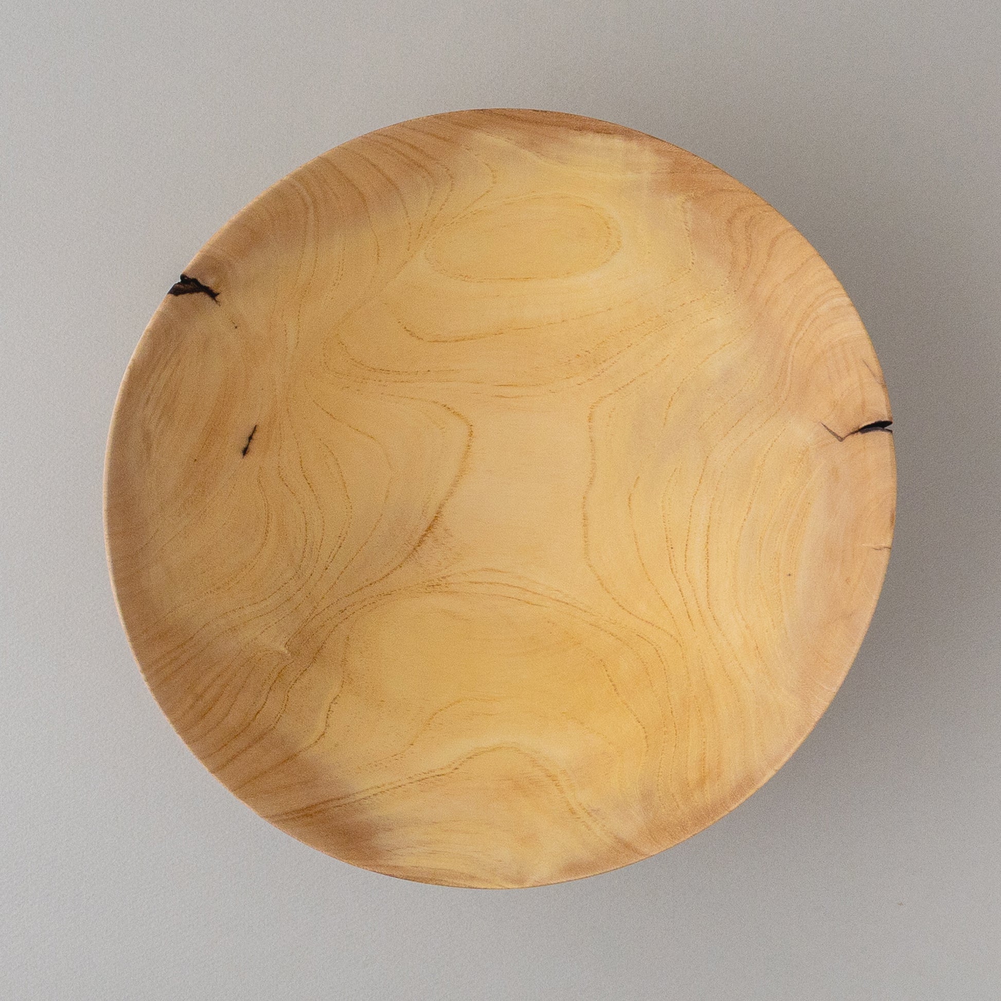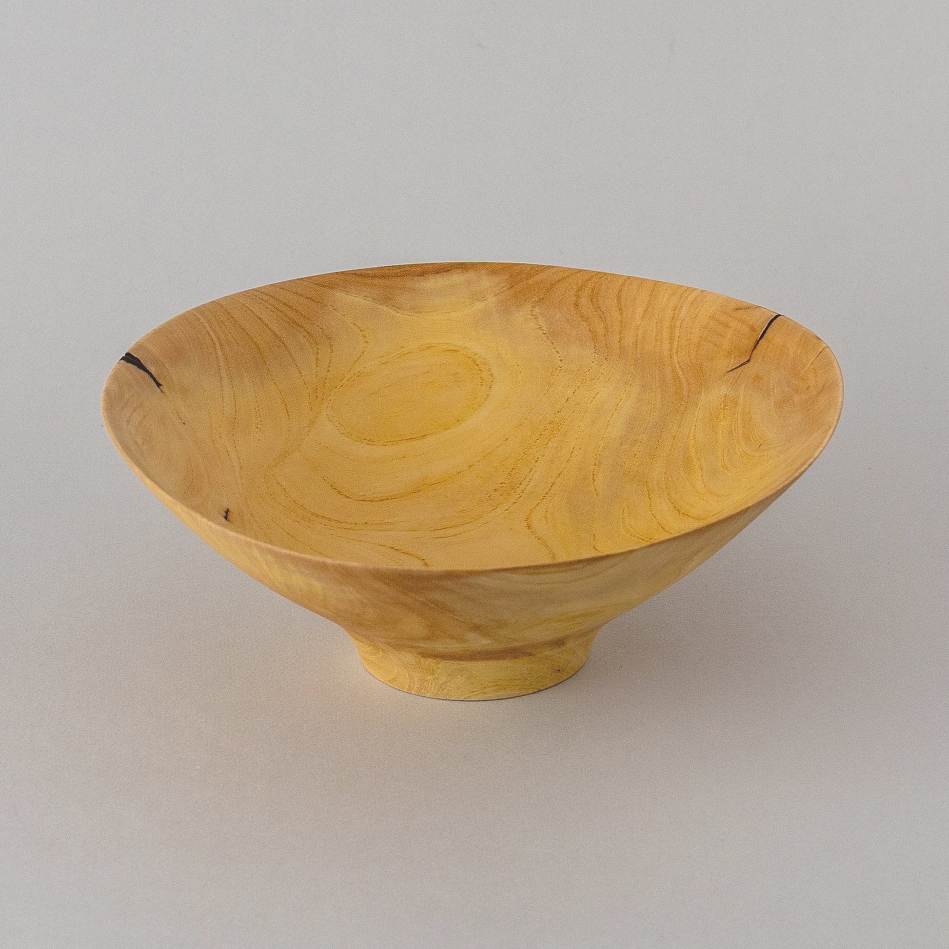 木目も穏やかでサラリとした手触りのチシャノキ、口縁を薄く引き乾燥を木に委ね、歪ませる事により動きのある作品に仕上げる。