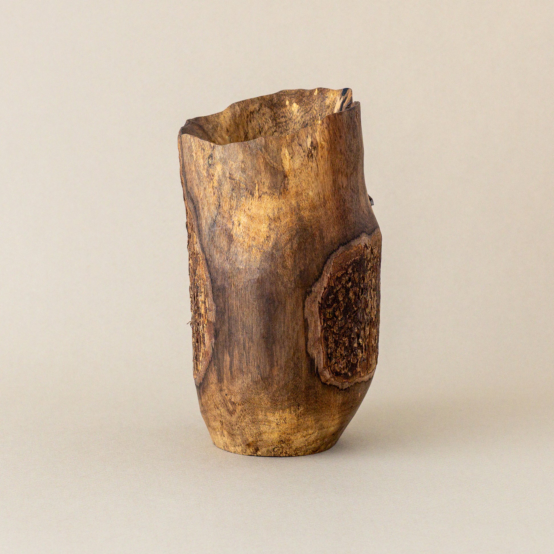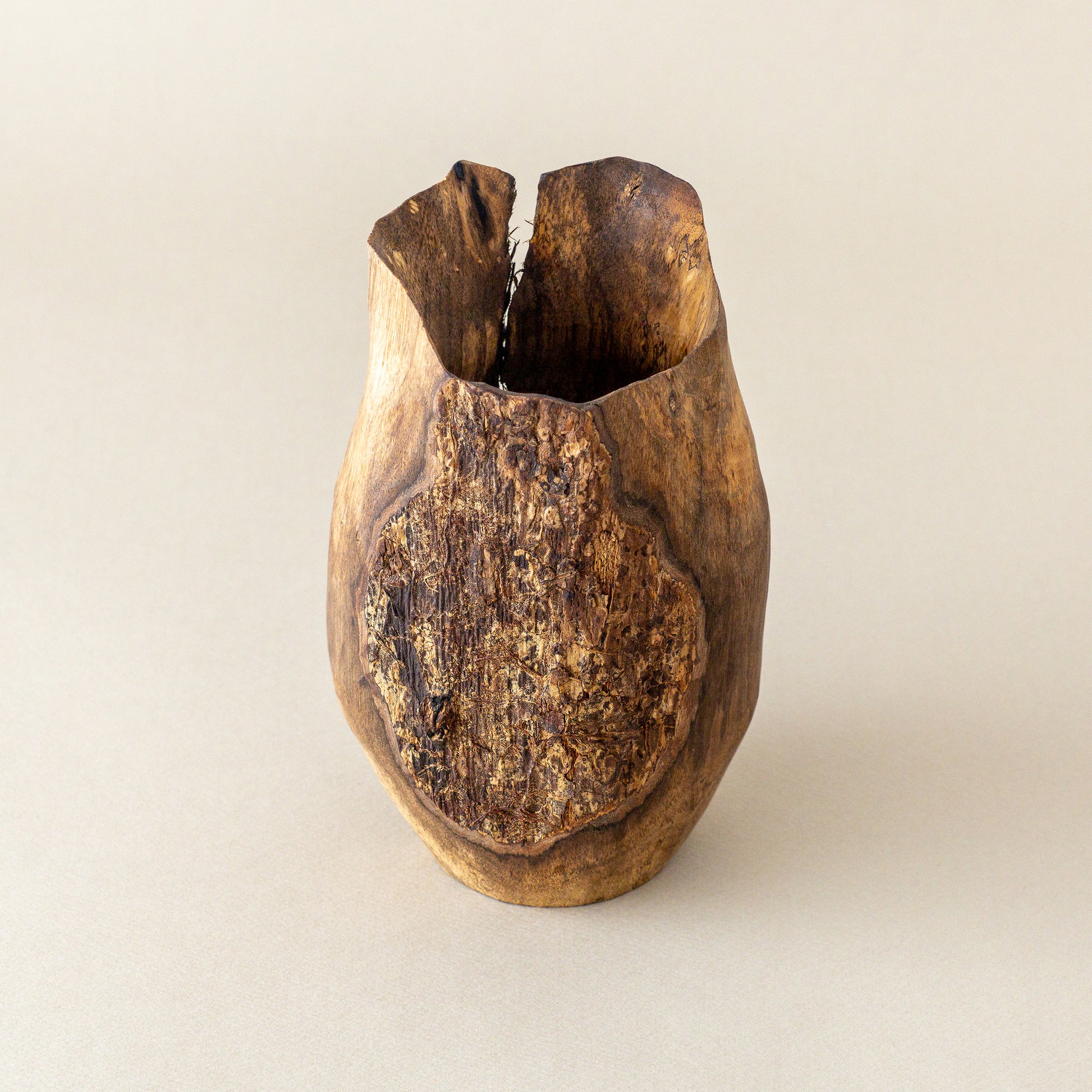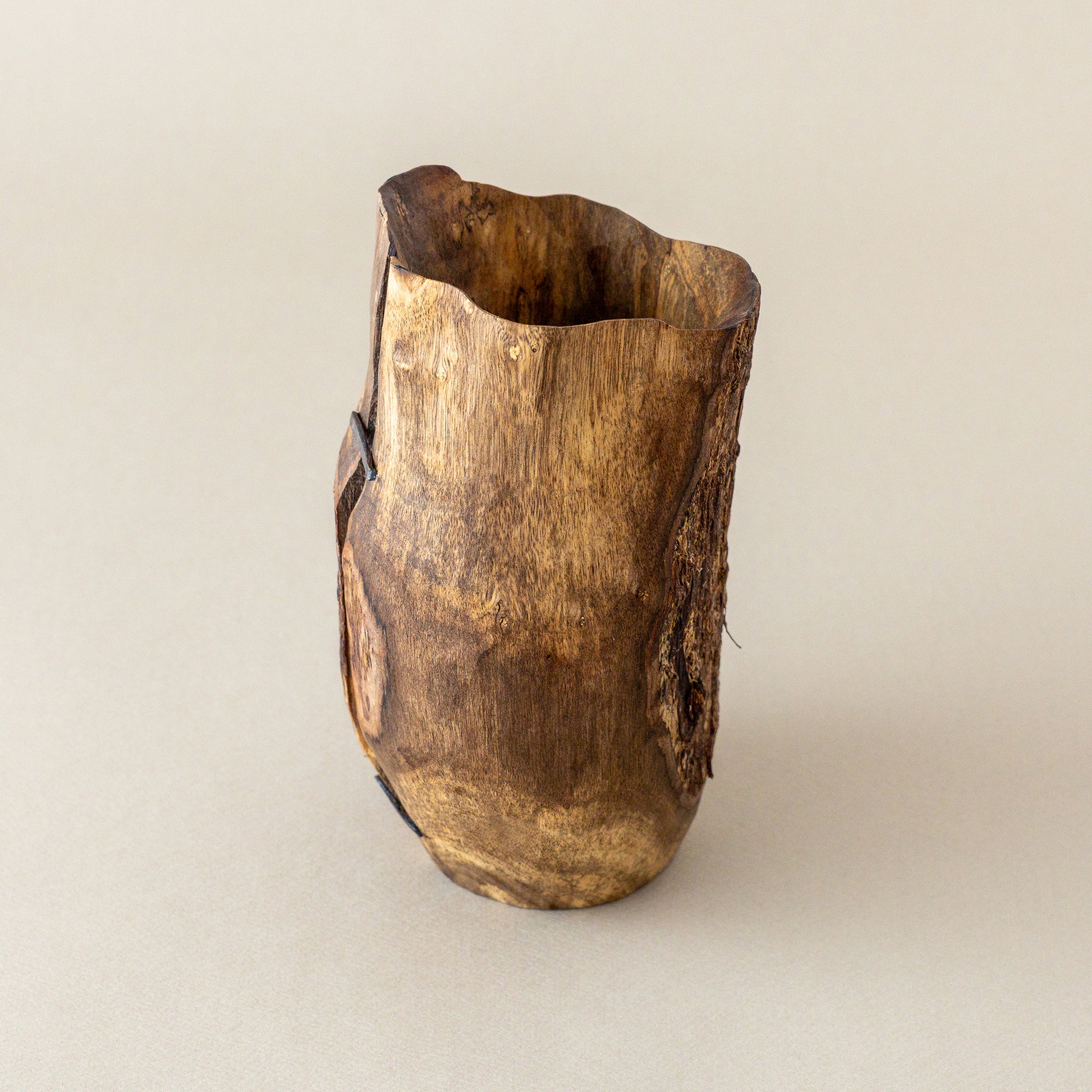 表皮が残され生きていた木の表情を残す。縁は薄めに繊細に彫られ、力強く鎹が打たれた柿の木の花器。オブジェのような存在感。