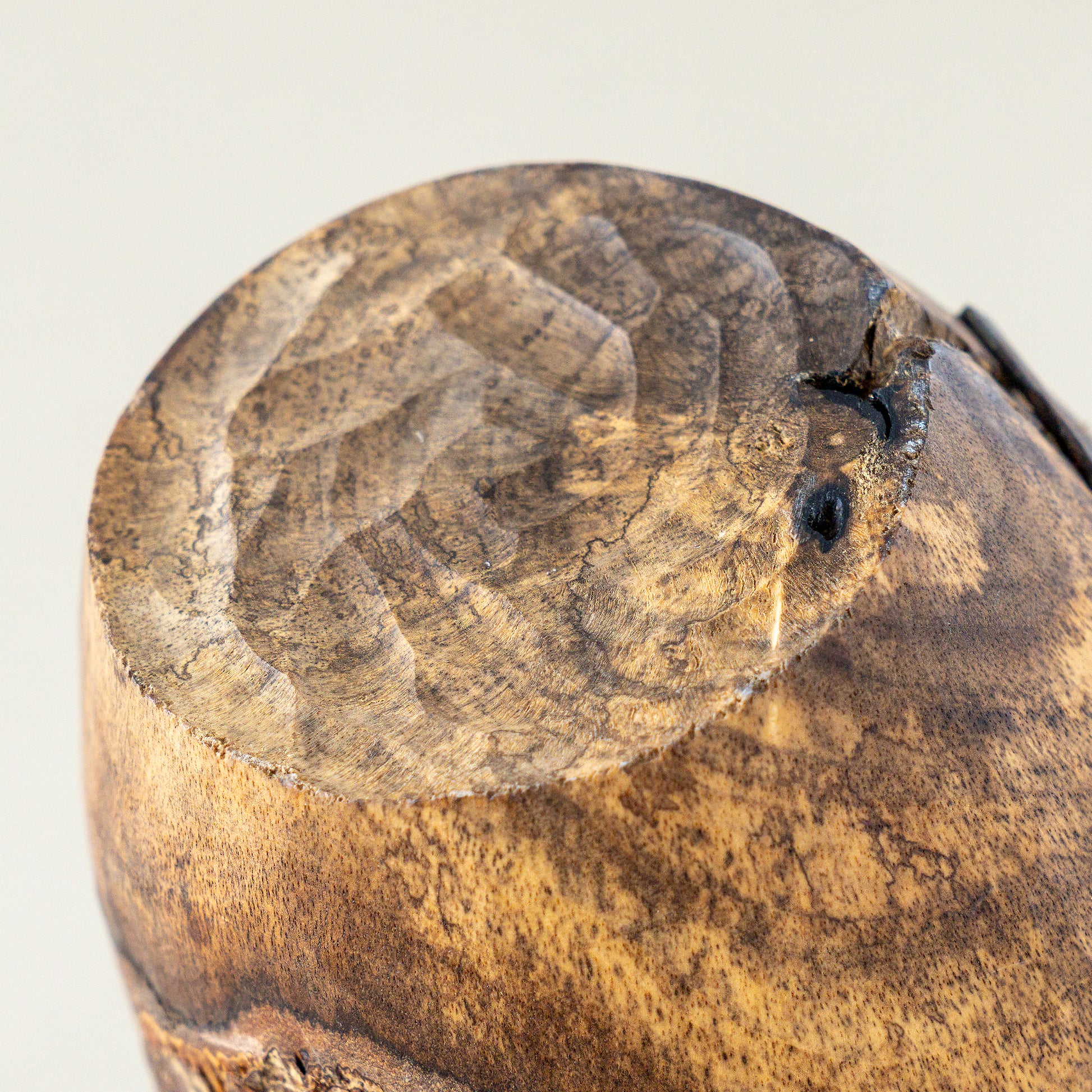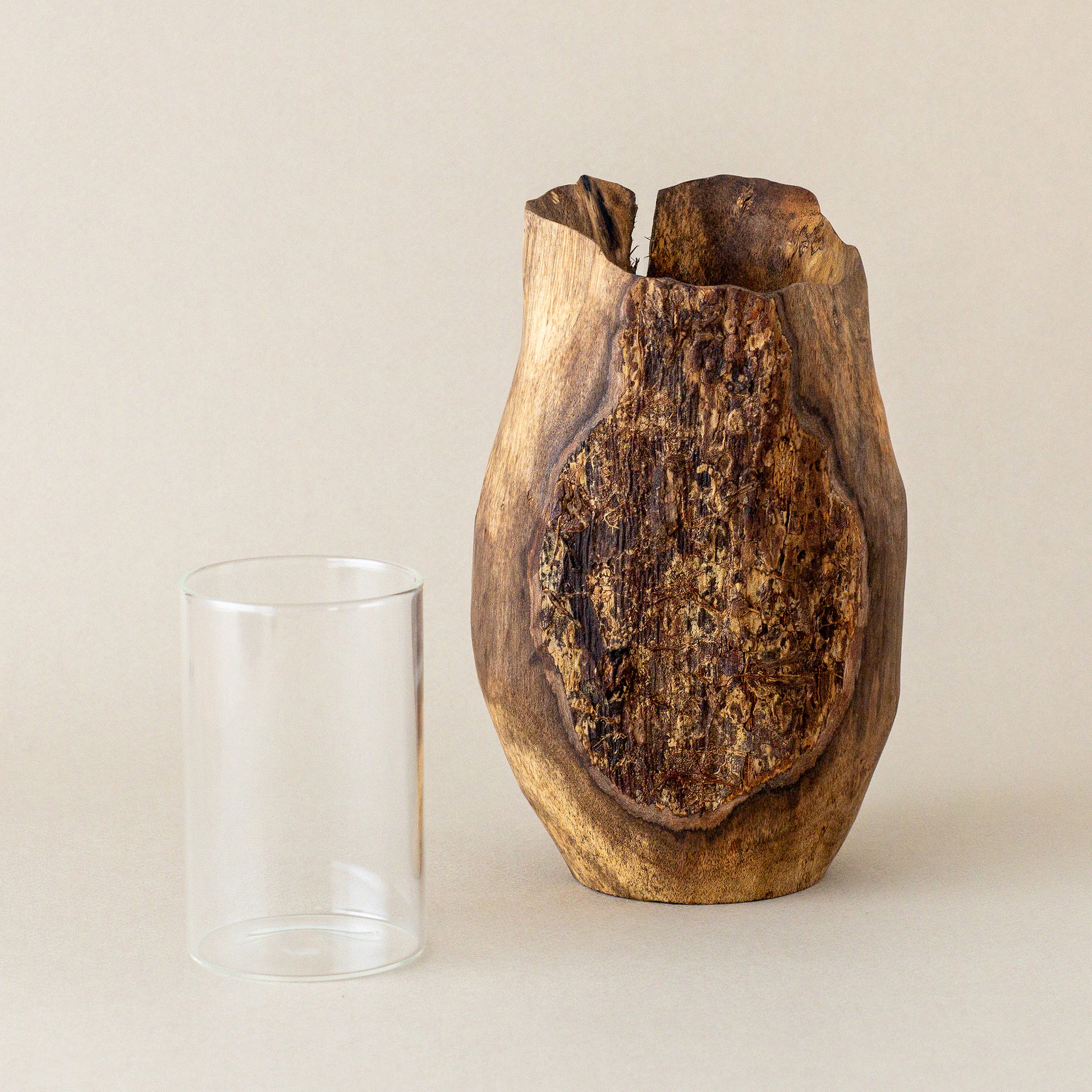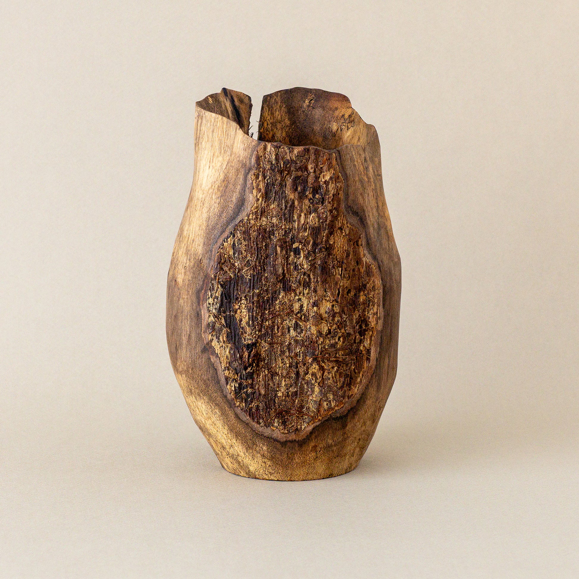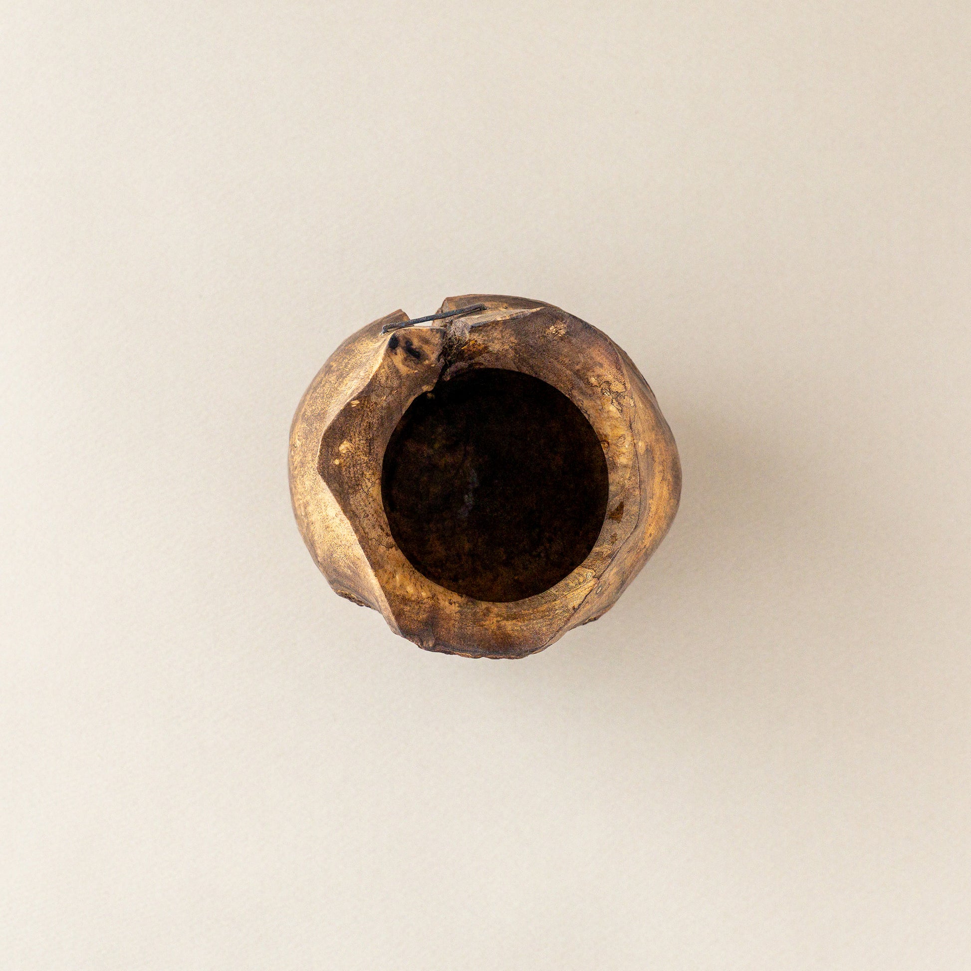 表皮が残され生きていた木の表情を残す。縁は薄めに繊細に彫られ、力強く鎹が打たれた柿の木の花器。オブジェのような存在感。