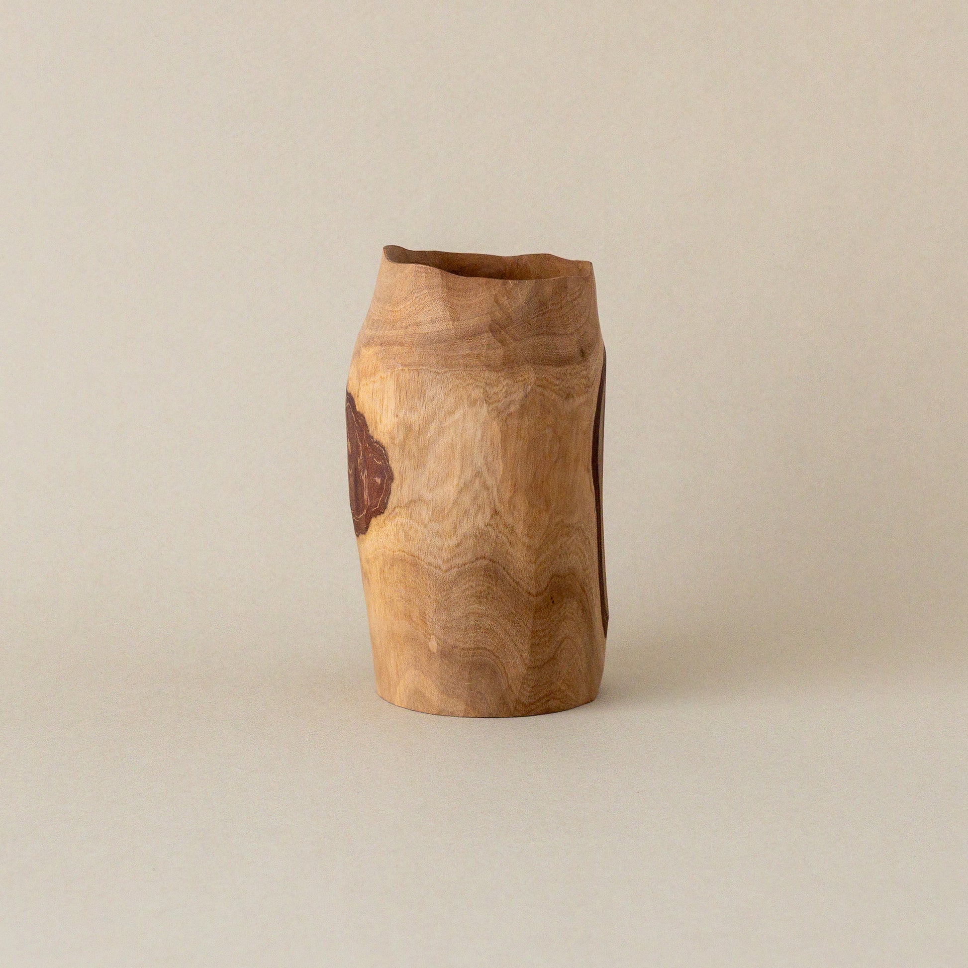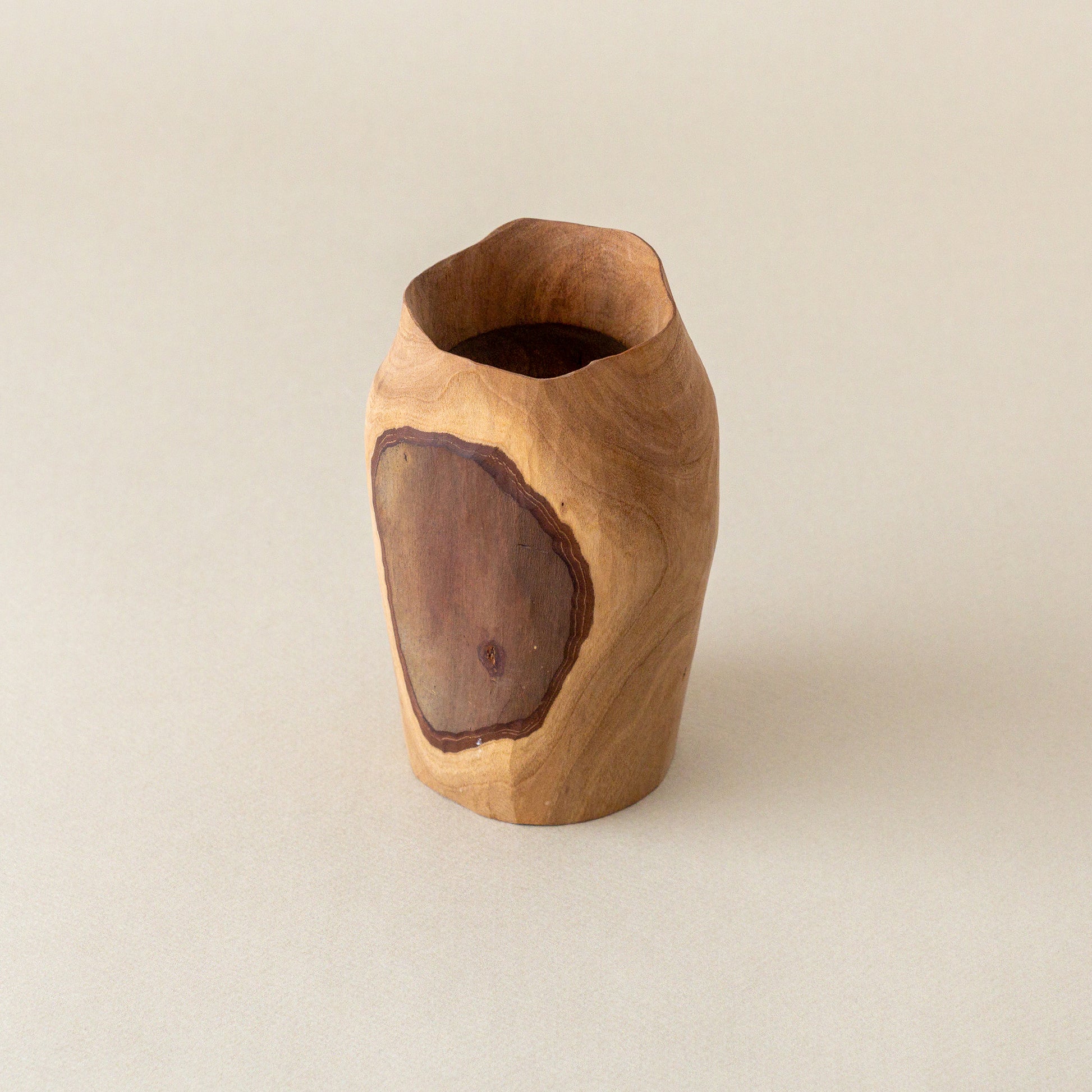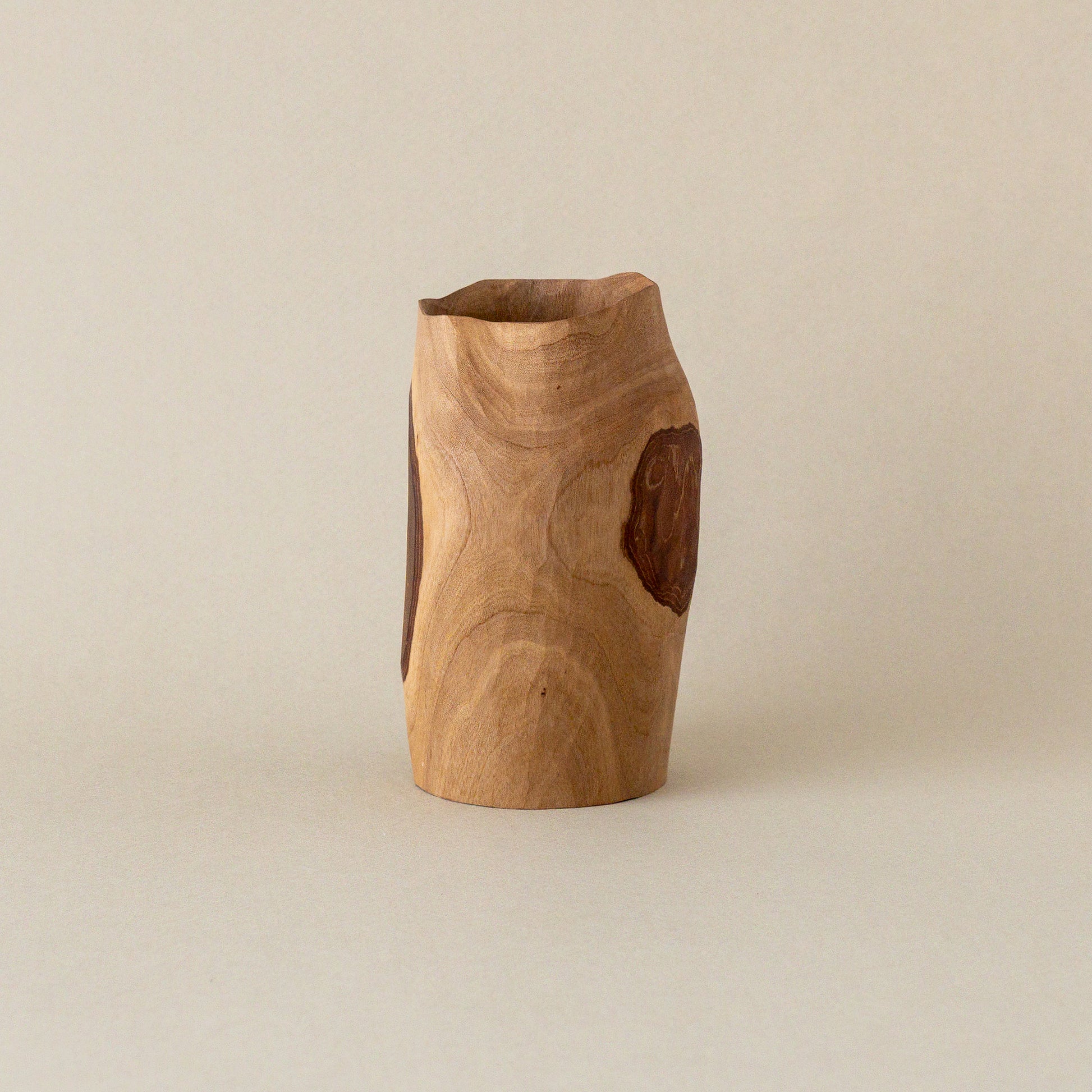 模様のように表と裏に表皮が残されたグァバの木の花器。向きや高さなどで表情が変わり、不思議と別のもののように思えてしまう。