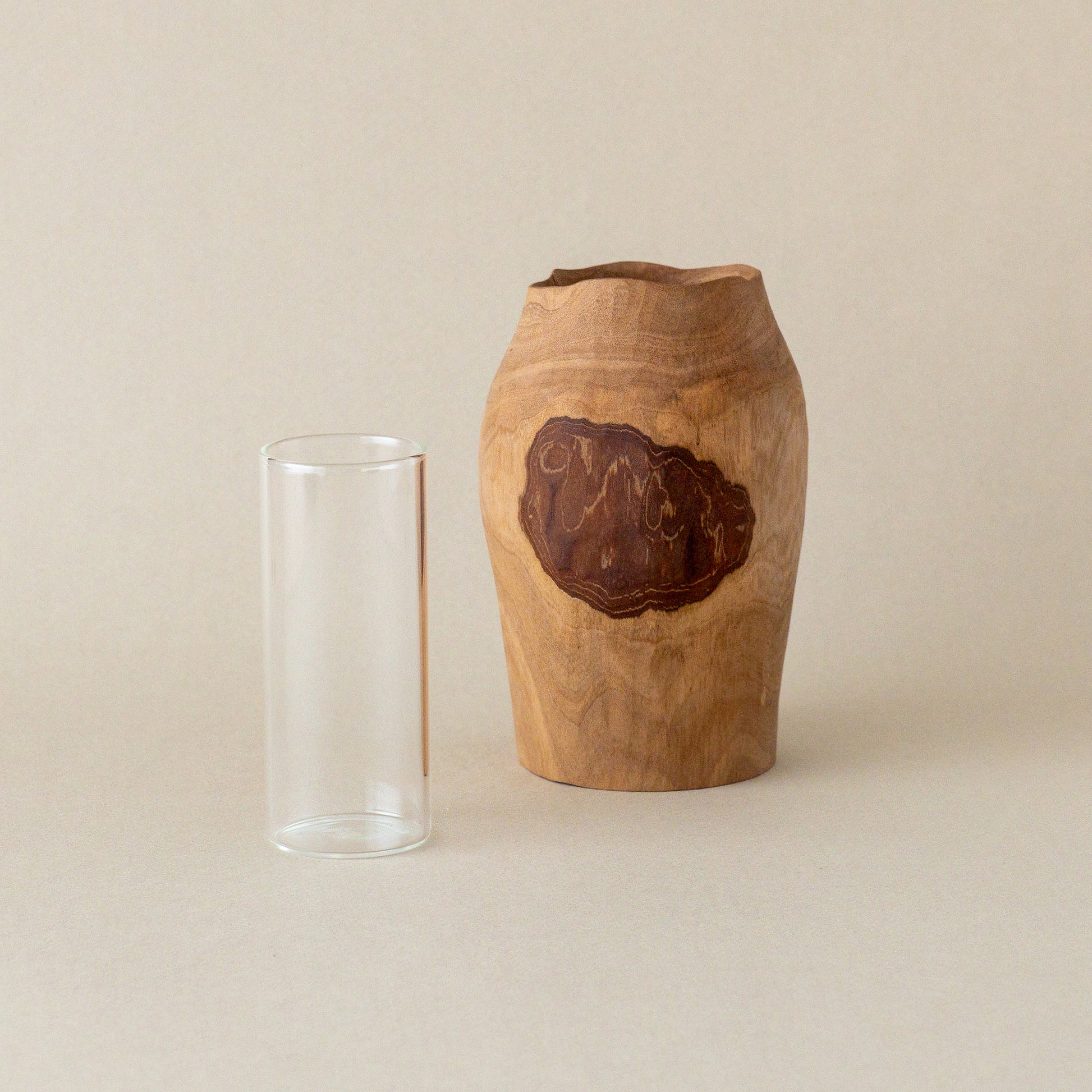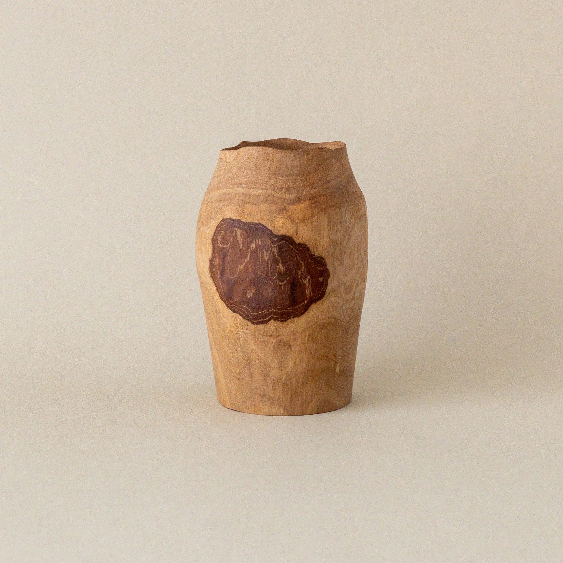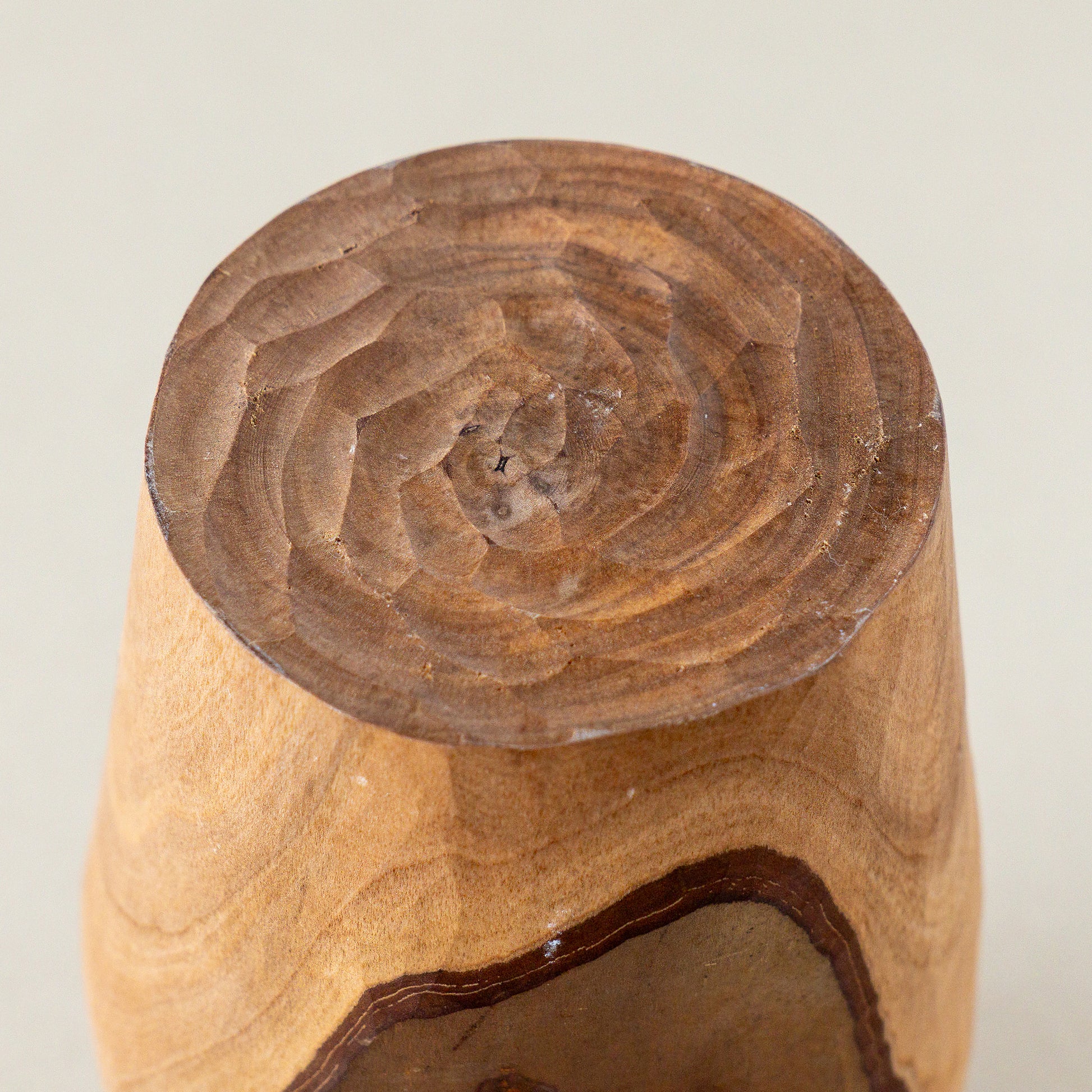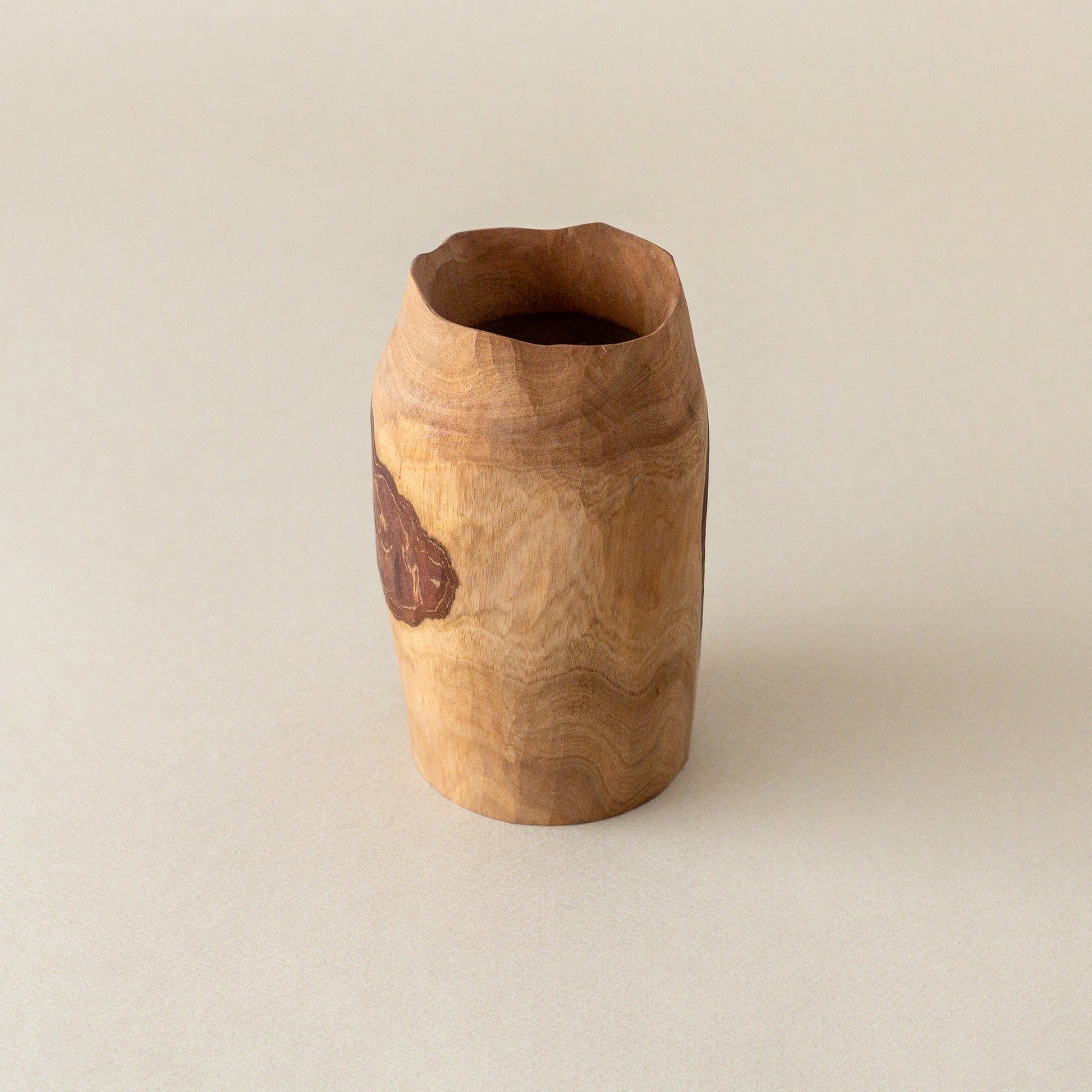 模様のように表と裏に表皮が残されたグァバの木の花器。向きや高さなどで表情が変わり、不思議と別のもののように思えてしまう。