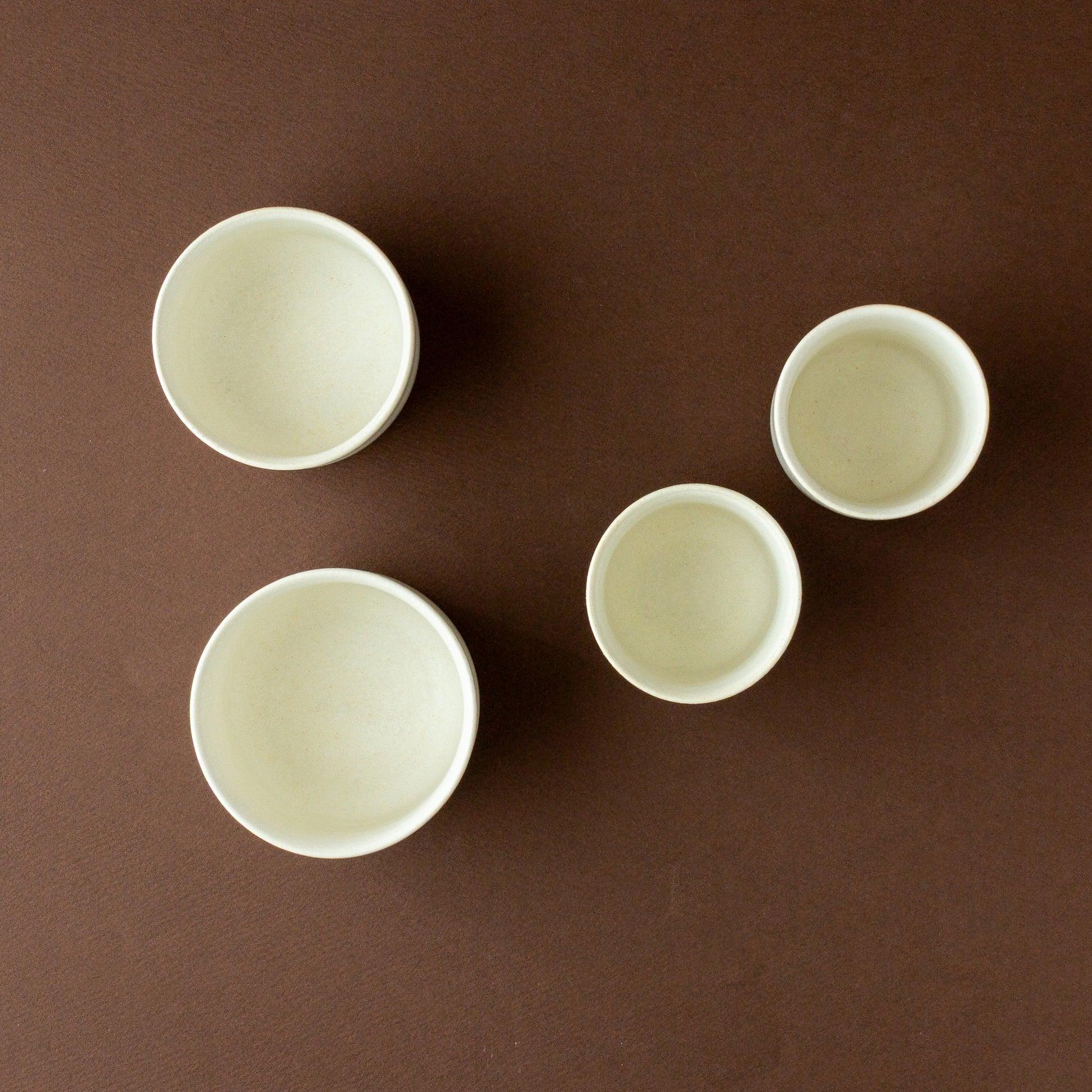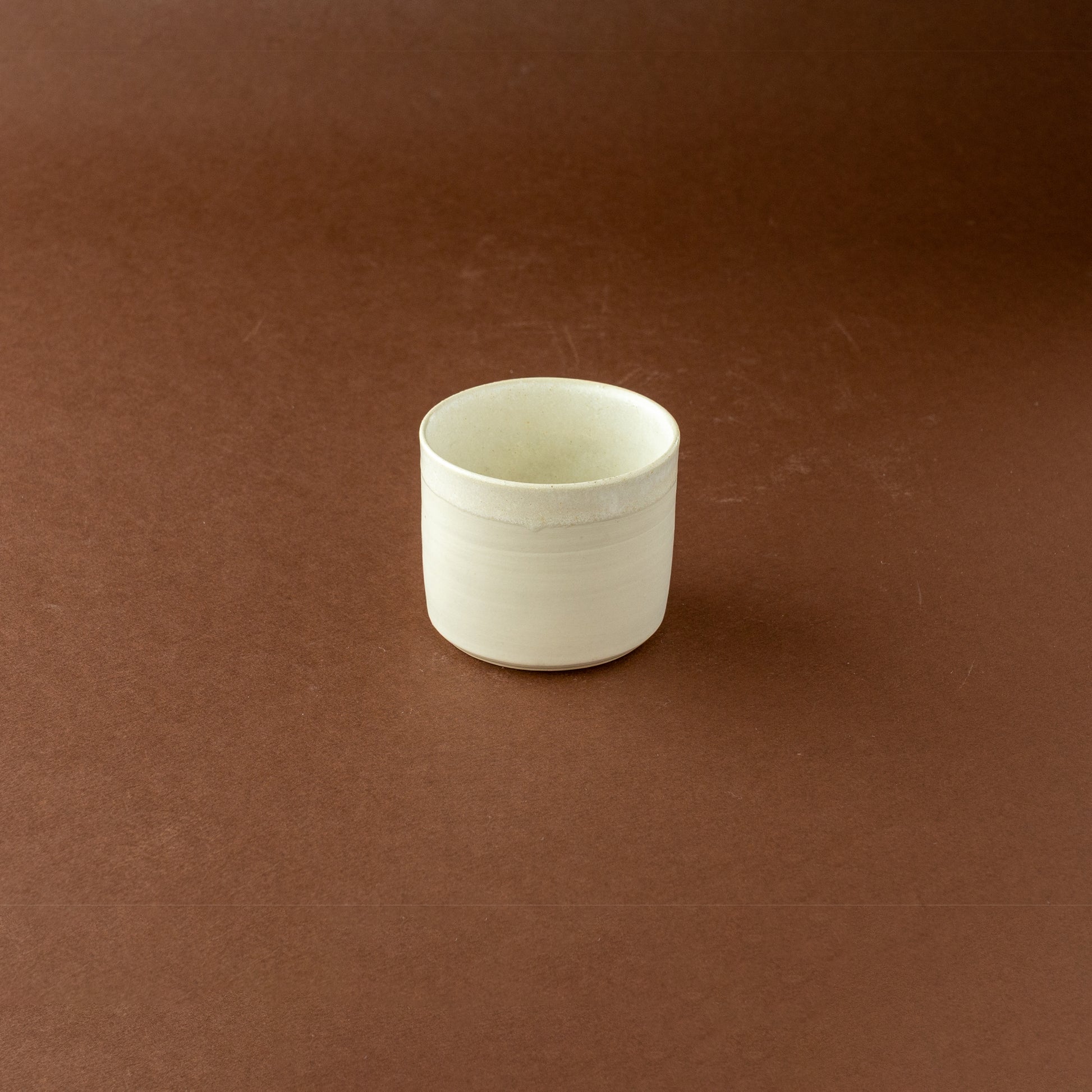 すっと手に馴染むサイズ感、口縁には釉薬がかかり口当たりも優しい。白く淡い柔らかな質感のカップ。