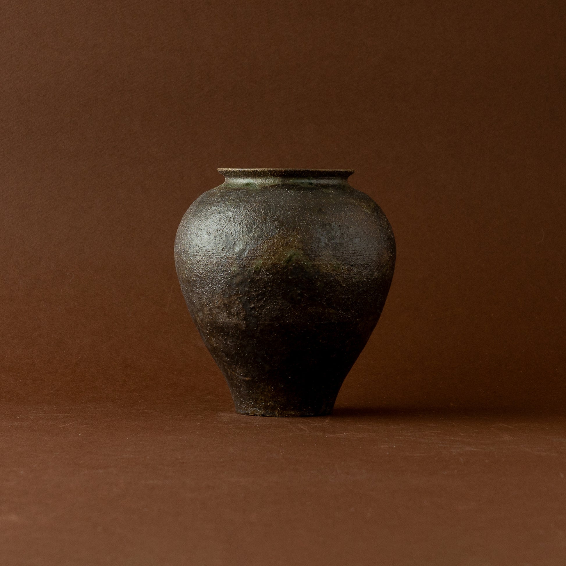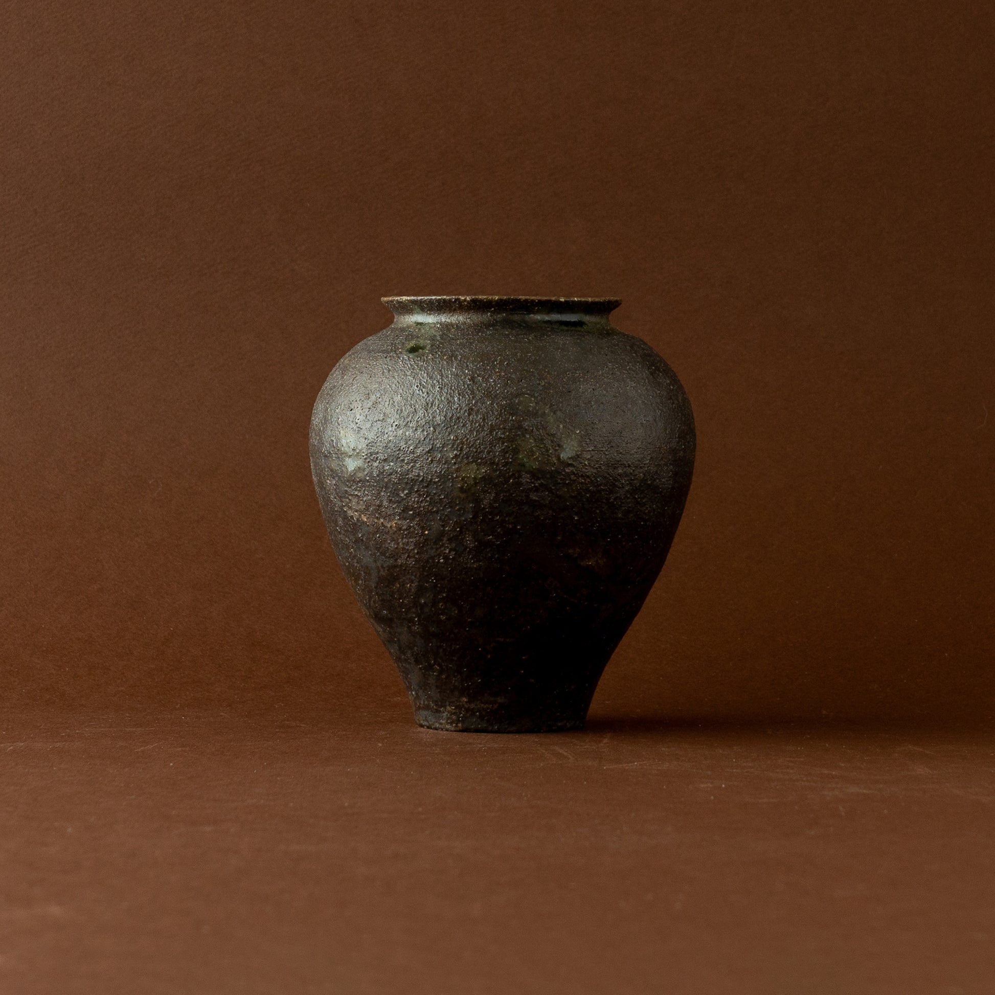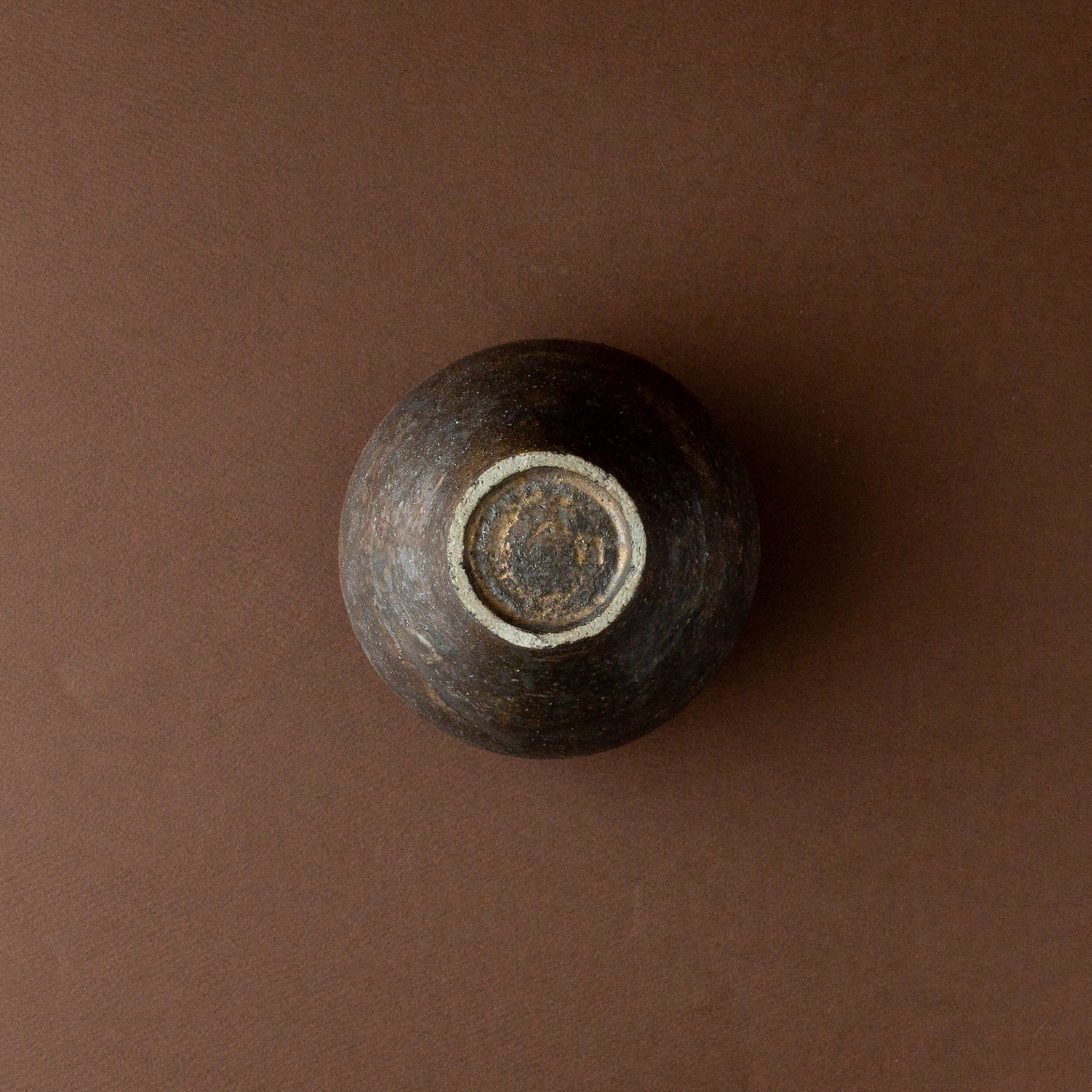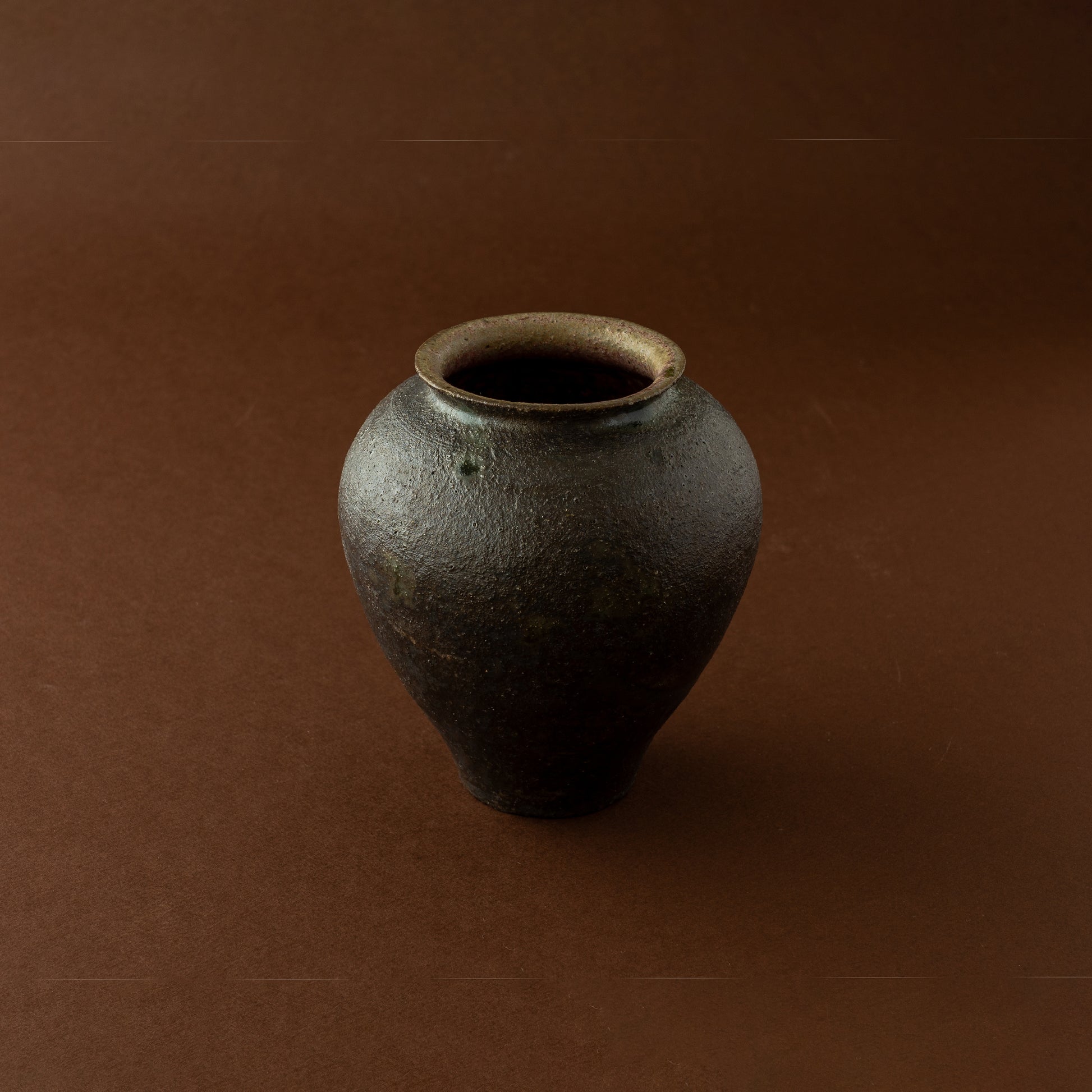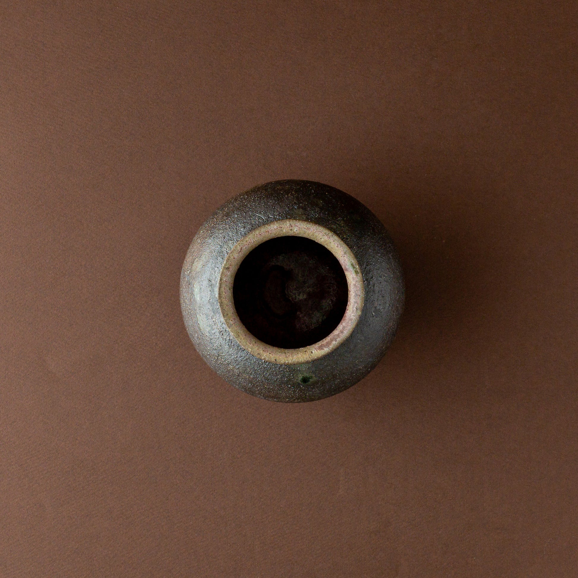 美しいフォルムの花器。外側は黒灰、ちらりと見える縁、内側には薄紅釉を。