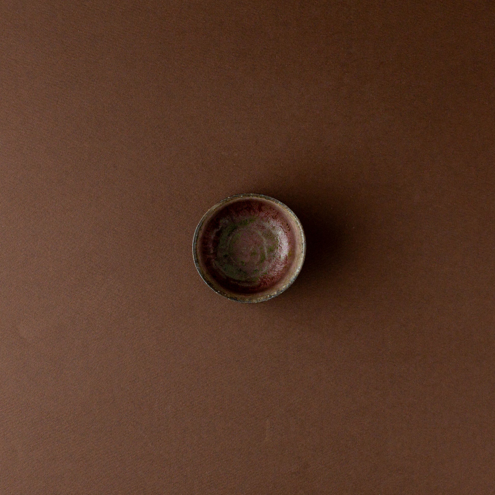 外には黒灰、内には薄紅釉を施し、薄めに引かれた個性的な杯。