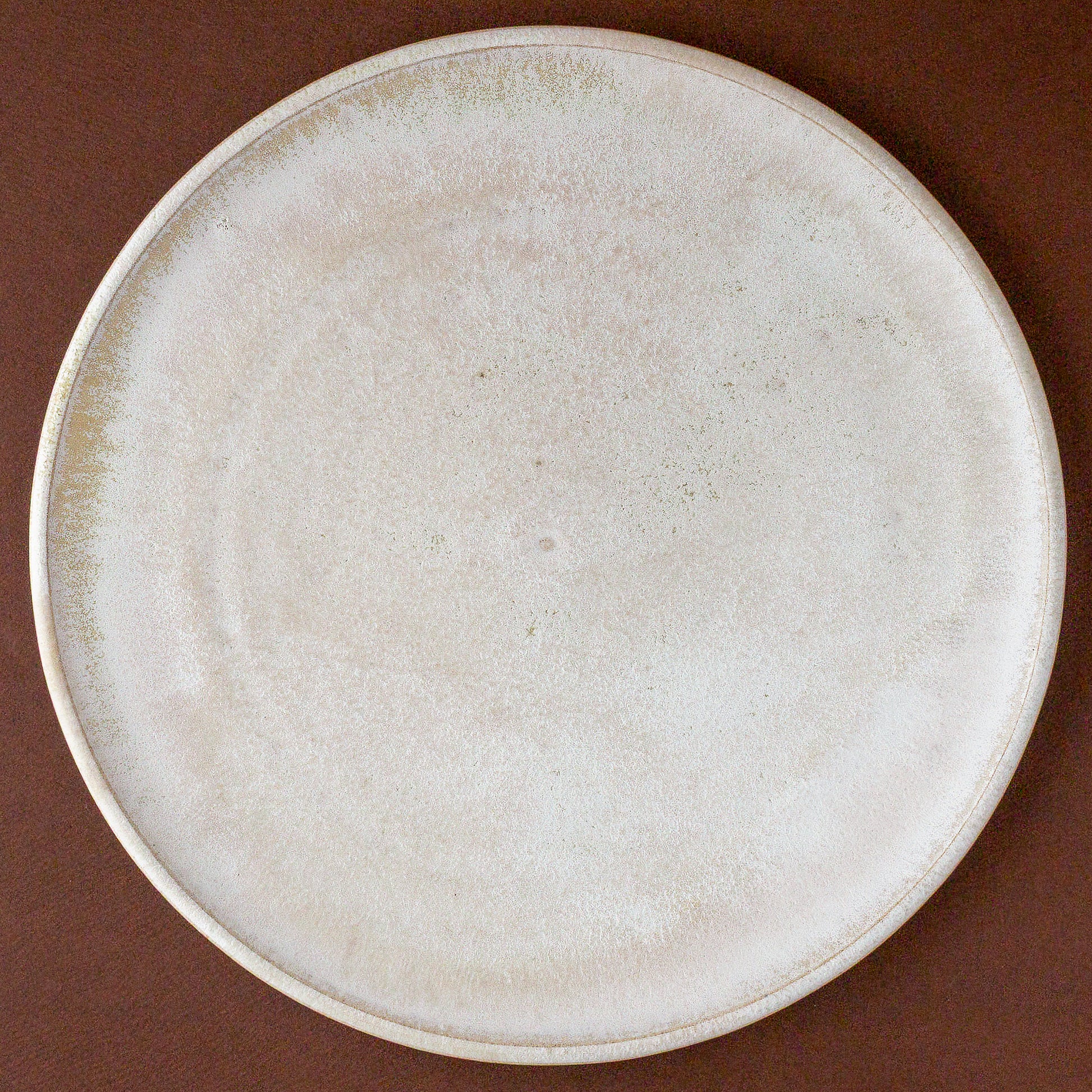 薄めのリム、ごくわずかな深さの淡いピンクホワイトのプレート。ワンプレートでも余白を大胆に表現するのにも十分な1尺サイズ